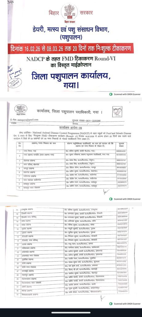 गयाजी; राष्ट्रीय पशु रोग नियंत्रण कार्यक्रम (NADCP) के तहत गयाजी जिले में 16 फरवरी 2026 से 8 मार्च 2026 तक 20 दिवसीय निःशुल्क FMD (Foot and Mouth Disease) टीकाकरण अभियान चलाया जा रहा है। यह कार्यक्रम पशुओं को खुरपका-मुंहपका रोग से बचाने के उद्देश्य से संचालित किया जा रहा है।