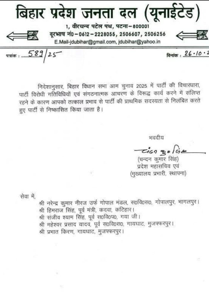 पटना, बिहार प्रदेश जनता दल (यूनाइटेड) ने विधानसभा चुनाव 2025 के दौरान पार्टी की विचारधारा और संगठनात्मक अनुशासन के विरुद्ध कार्य करने के आरोप में अपने पांच नेताओं को तत्काल प्रभाव से पार्टी से निष्कासित कर दिया है।