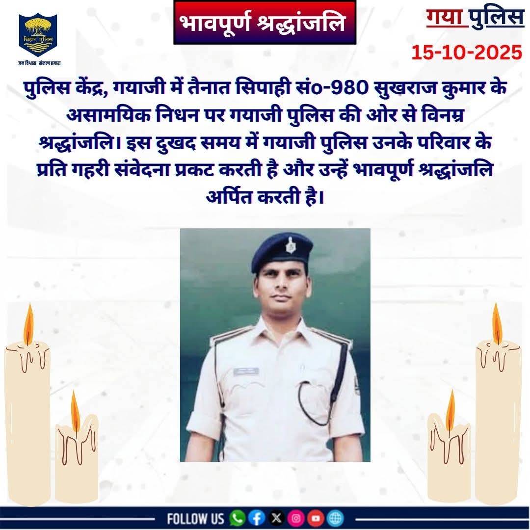 गयाजी, पुलिस केंद्र में तैनात सिपाही संख्या 980 सुखराज कुमार के असामयिक निधन से गयाजी पुलिस परिवार में शोक की लहर है। उनके निधन की सूचना मिलते ही पुलिस विभाग में गम का माहौल व्याप्त हो गया।